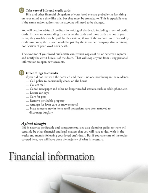 This dual purpose personal planning guide is beneficial for both preneed and at need families. For preneed families it contains a complete list of decisions that need to be addressed for preplanning a funeral. For at need families it has a comprehensive checklist of things that need to be done following the death of a loved one.