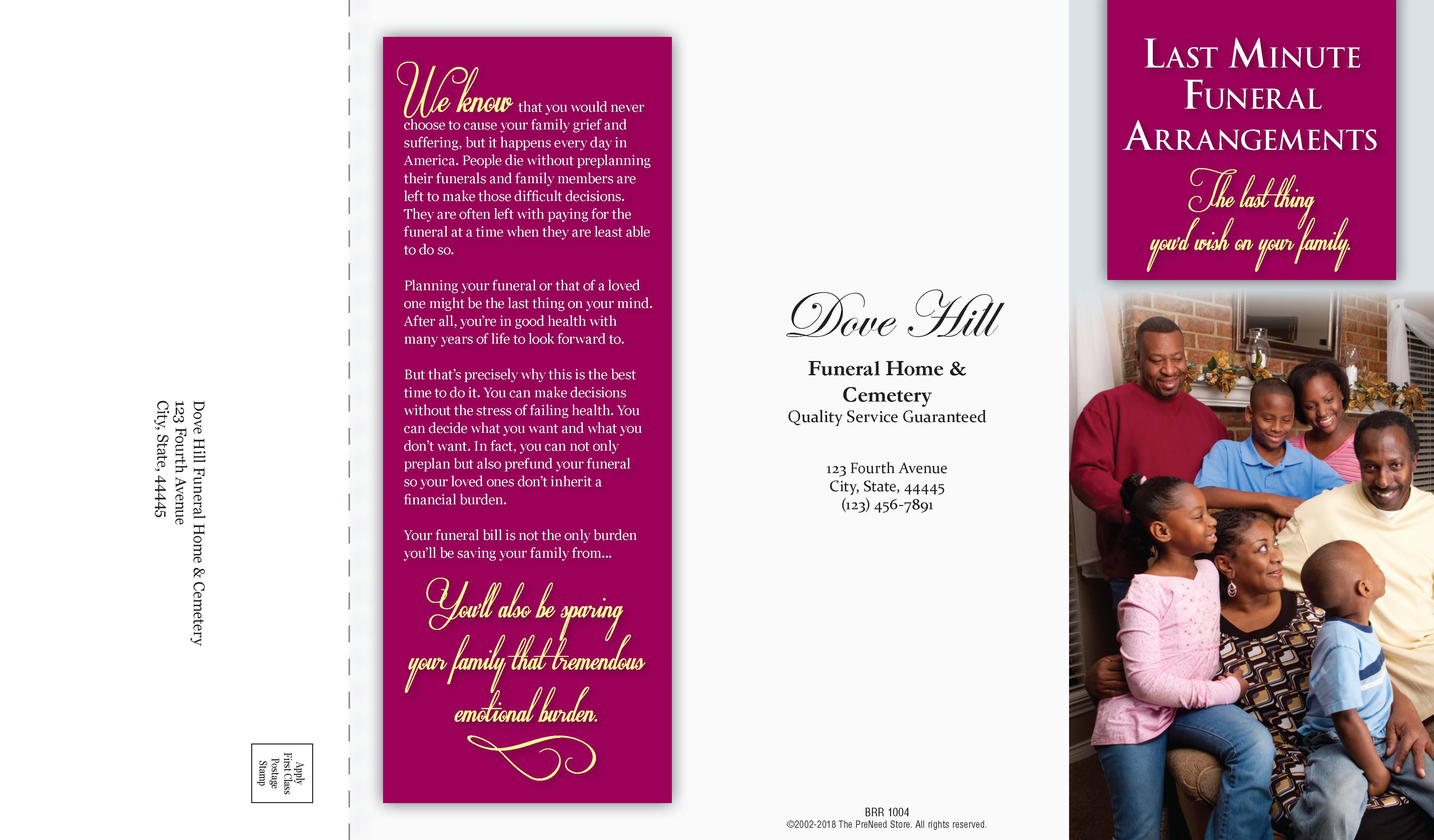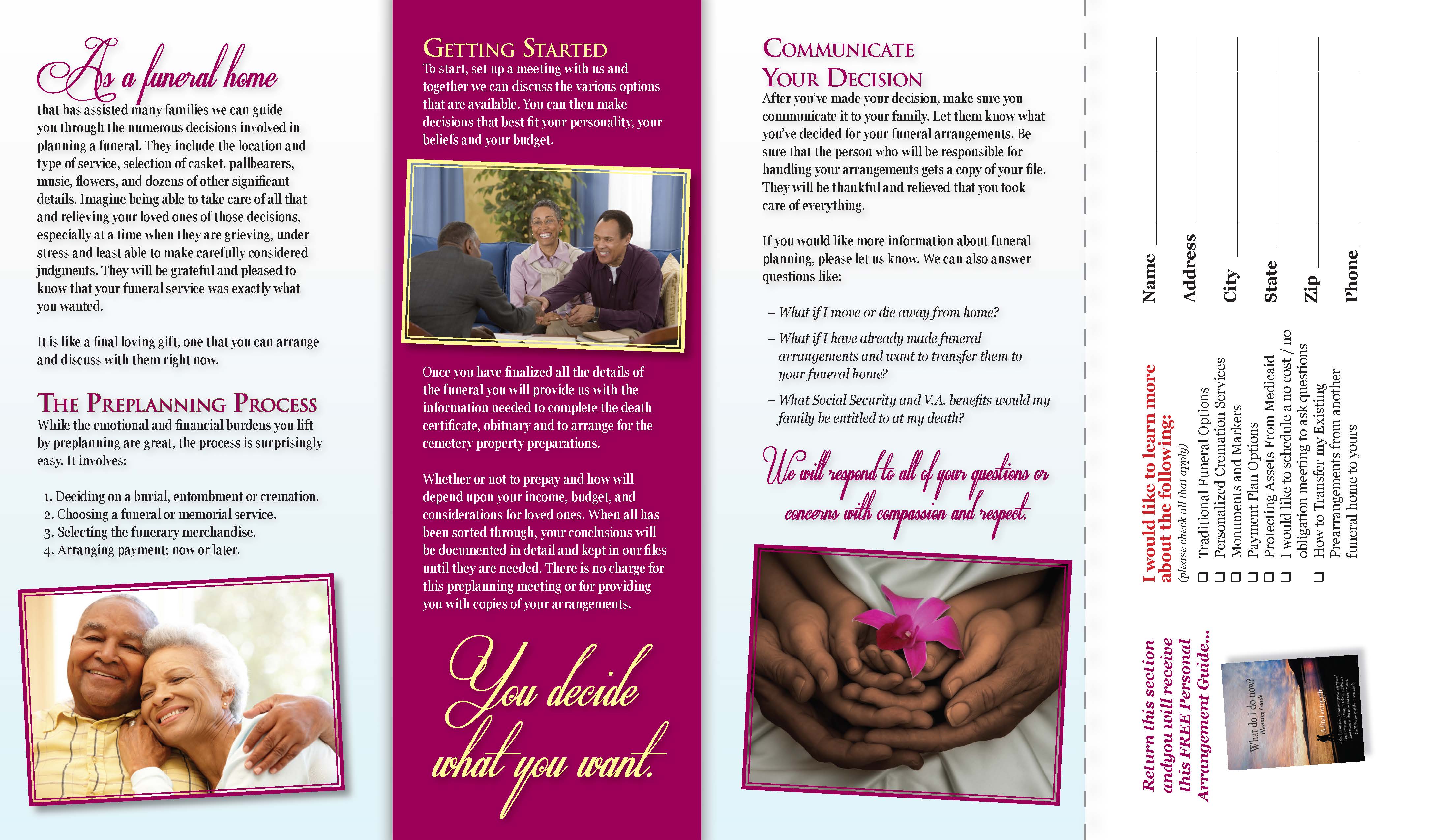 This preneed - preplanning brochure explains how and why the best time to preplan a funeral is now. The brochure will have your businesses personal information and logo included on one of the panels and offers a detachable card that recipients are able to select what information they would like to learn more about.