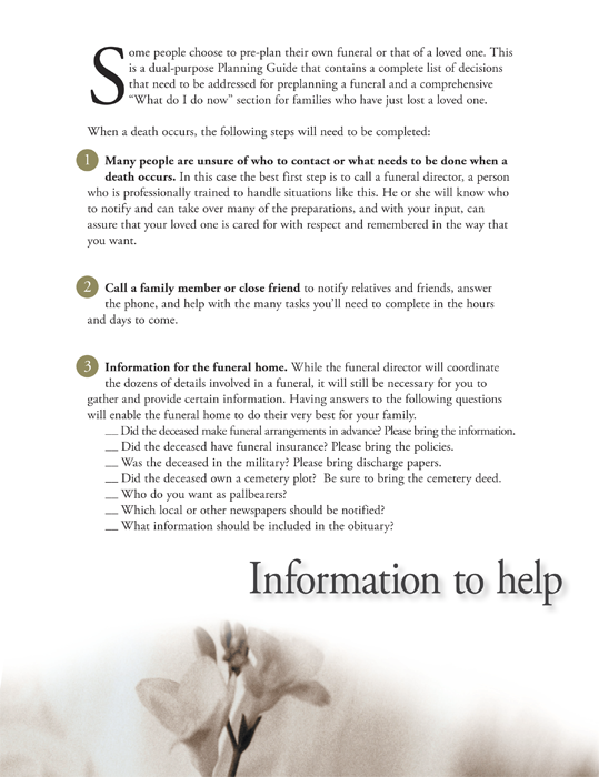 This dual purpose personal planning guide is beneficial for both preneed and at need families. For preneed families it contains a complete list of decisions that need to be addressed for preplanning a funeral. For at need families it has a comprehensive checklist of things that need to be done following the death of a loved one.