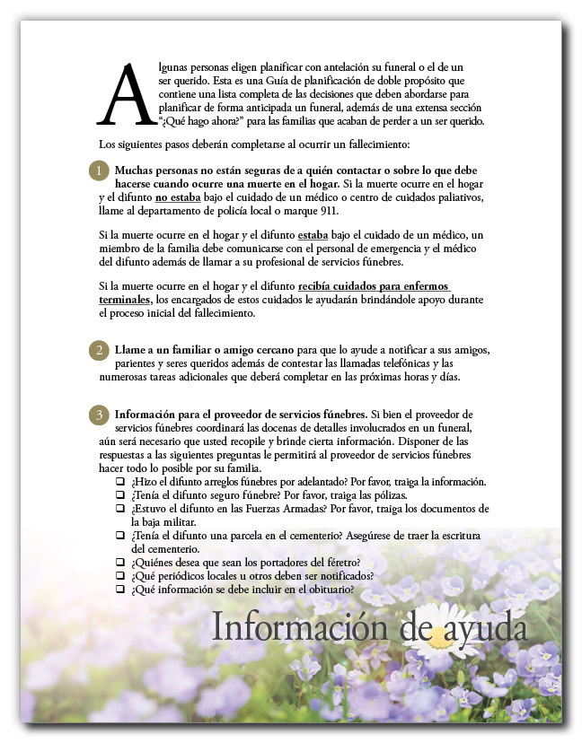 This dual purpose Planning Guide is beneficial for both preneed and at need families. For preneed families it contains a complete list of decisions that need to be addressed for preplanning a funeral. For at need families it has a comprehensive checklist of things that need to be done following the death of a loved one.